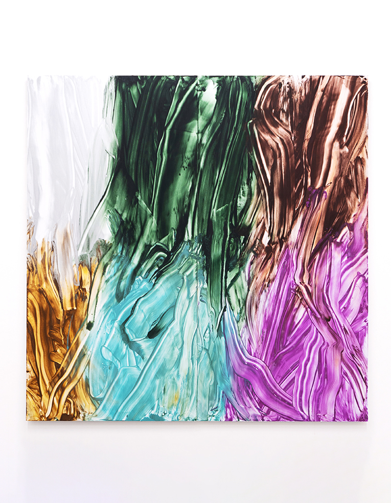 本展で発表する「rub」「veil」シリーズでも自作の絵具を作家自らの手足につけ、踊るように(時にもがくように)痕跡をキャンバスに残します。両手または両手両足で描く「rub」は、鮮やかな色彩同士が一方に入り込みながらも、個々の領域は尊重しながら画面上に共存します。「veil」では特殊な顔料を用い、二色の下地の上に塗られた同一色の絵具は全く異なる色として浮かび上がります。それは私たちの世界でも起こりうることを提示するような不思議な美しさを讃えます。